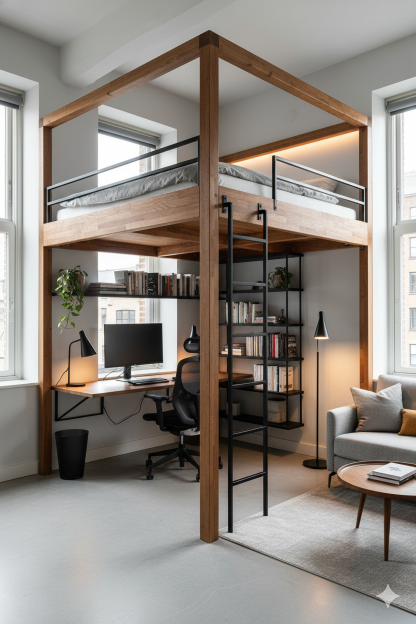 The Logic: While other layouts focus on horizontal zoning, this is vertical zoning. It "merge[s] sleeping and working areas within a single footprint". This is arguably the most efficient layout, as it stacks the two least-compatible functions (sleep and work) on top of each other, completely isolating them without using a single extra square inch of floor.