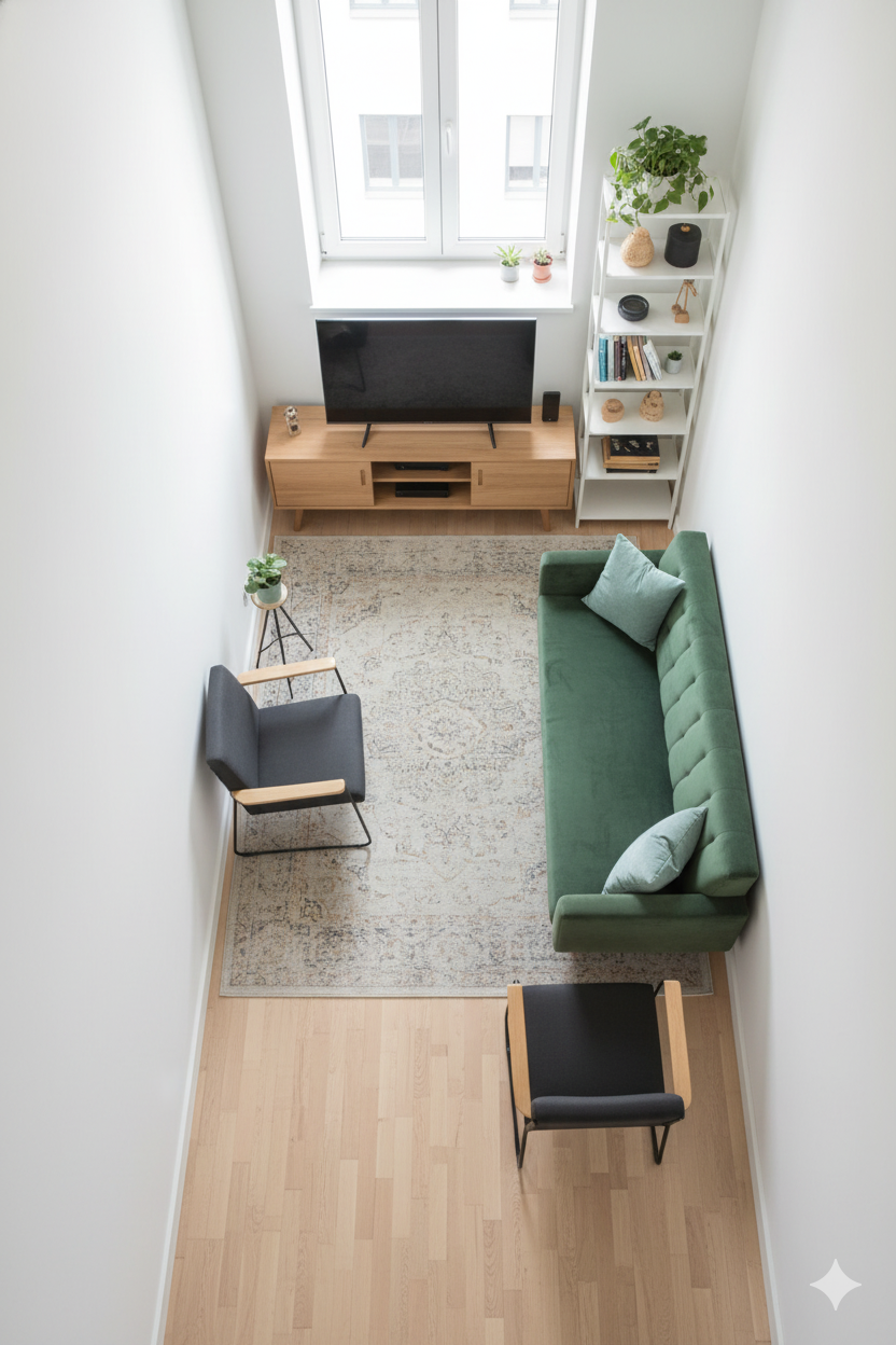 This layout is the single most effective strategy to break the "bowling alley" effect. Psychologically, it is a power move: instead of letting the room's awkward architecture dictate the layout, the "floating" arrangement imposes a new, well-proportioned "room" inside the old one. The furniture, not the walls, defines the boundaries of the living space. This method does, however, have one caveat: it requires a certain minimum width. In an extremely narrow room (e.g., under 8 or 9 feet wide), floating furniture can indeed make the space feel more cramped and obstructive.