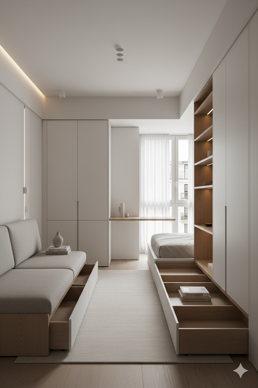 "Hidden" Storage: This involves creating storage in unseen places, such as using risers to elevate a bed frame for clear, stackable bins underneath , or even hiding items behind curtains or a large, leaning mirror.