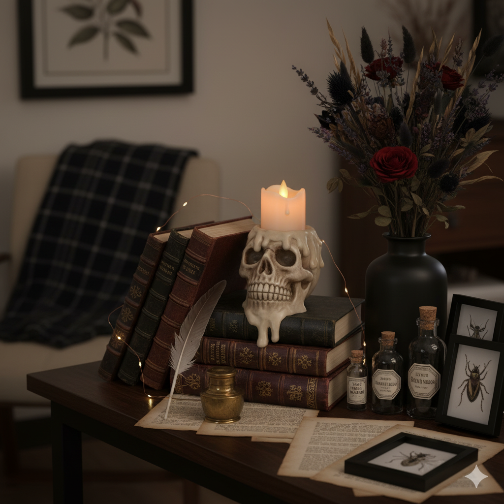 Whimsigoth and the Witch's Lair: Tapping into a moodier, more sophisticated aesthetic popular on social media. Key elements include dark fabrics like black lace, faux candelabras, potion bottles, dried herbs, spooky art prints, and atmospheric lighting from flameless candles and colored bulbs. The vibe is Dark Academia meets Practical Magic.