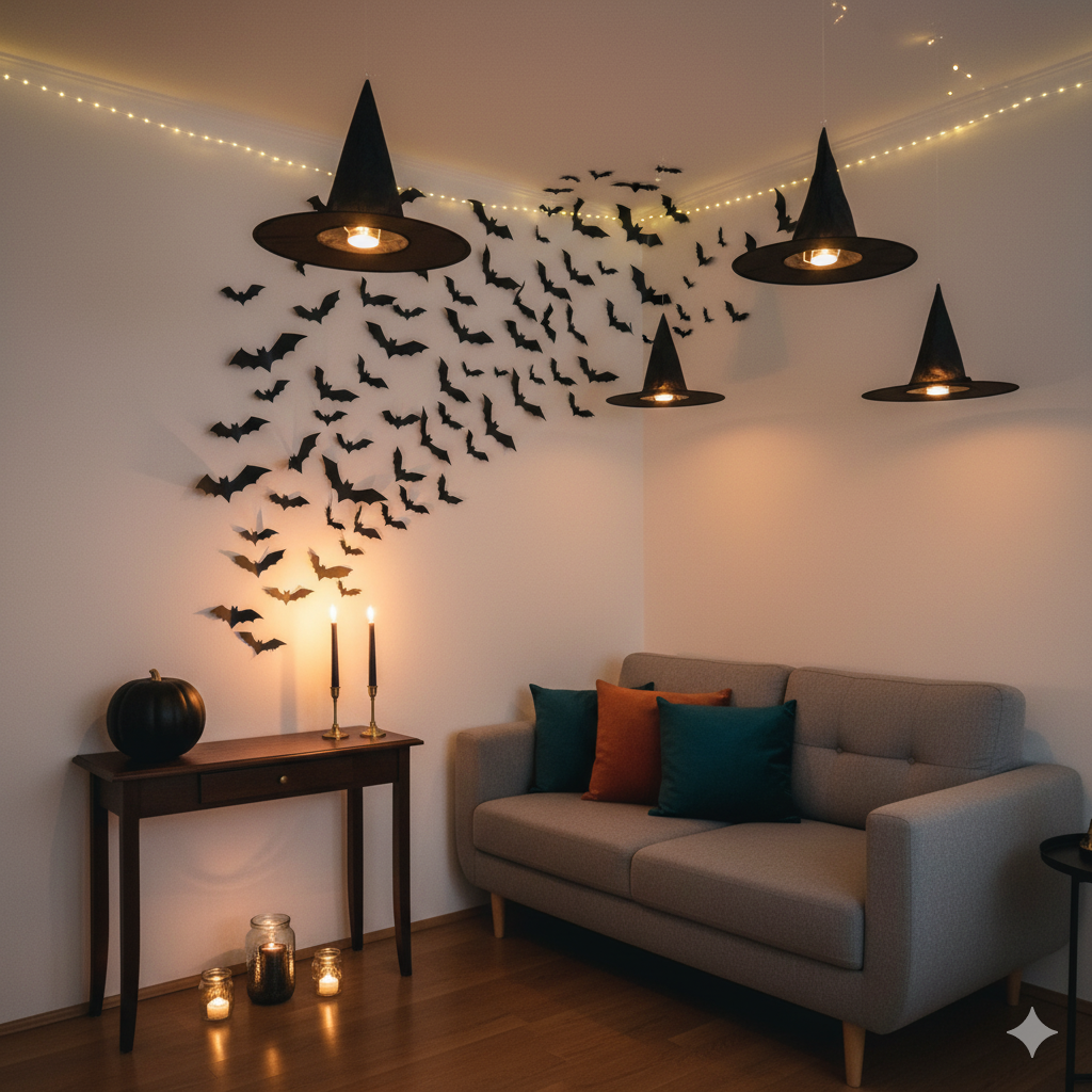 Ceiling Spectacles: Suspending lightweight items like floating witch hats with clear fishing line makes a room feel taller and more magical.