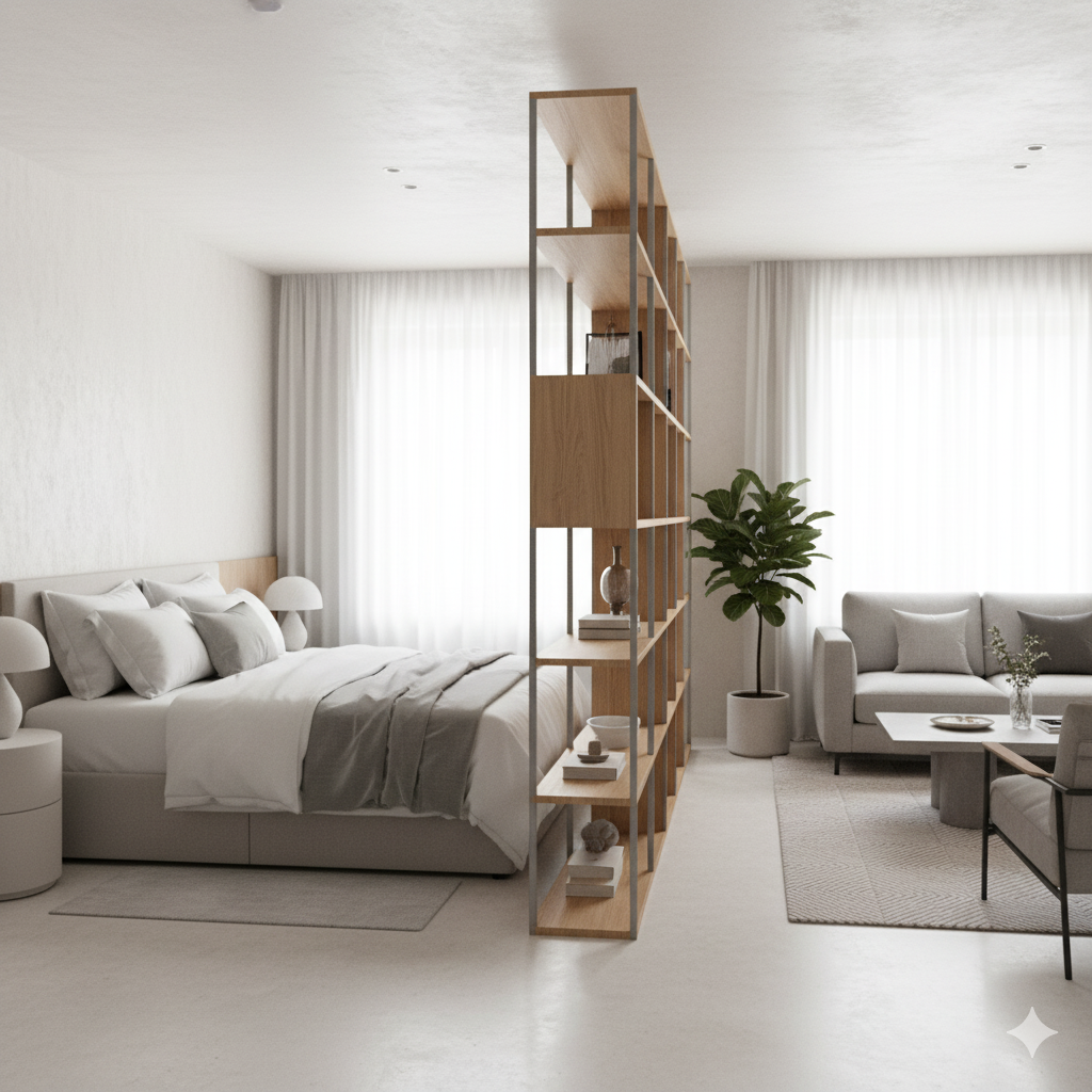 Multi-Purpose Dividers: Open-backed bookshelves and shelving systems are ideal dividers for a studio. They separate areas like the bedroom from the living room while providing valuable storage space.