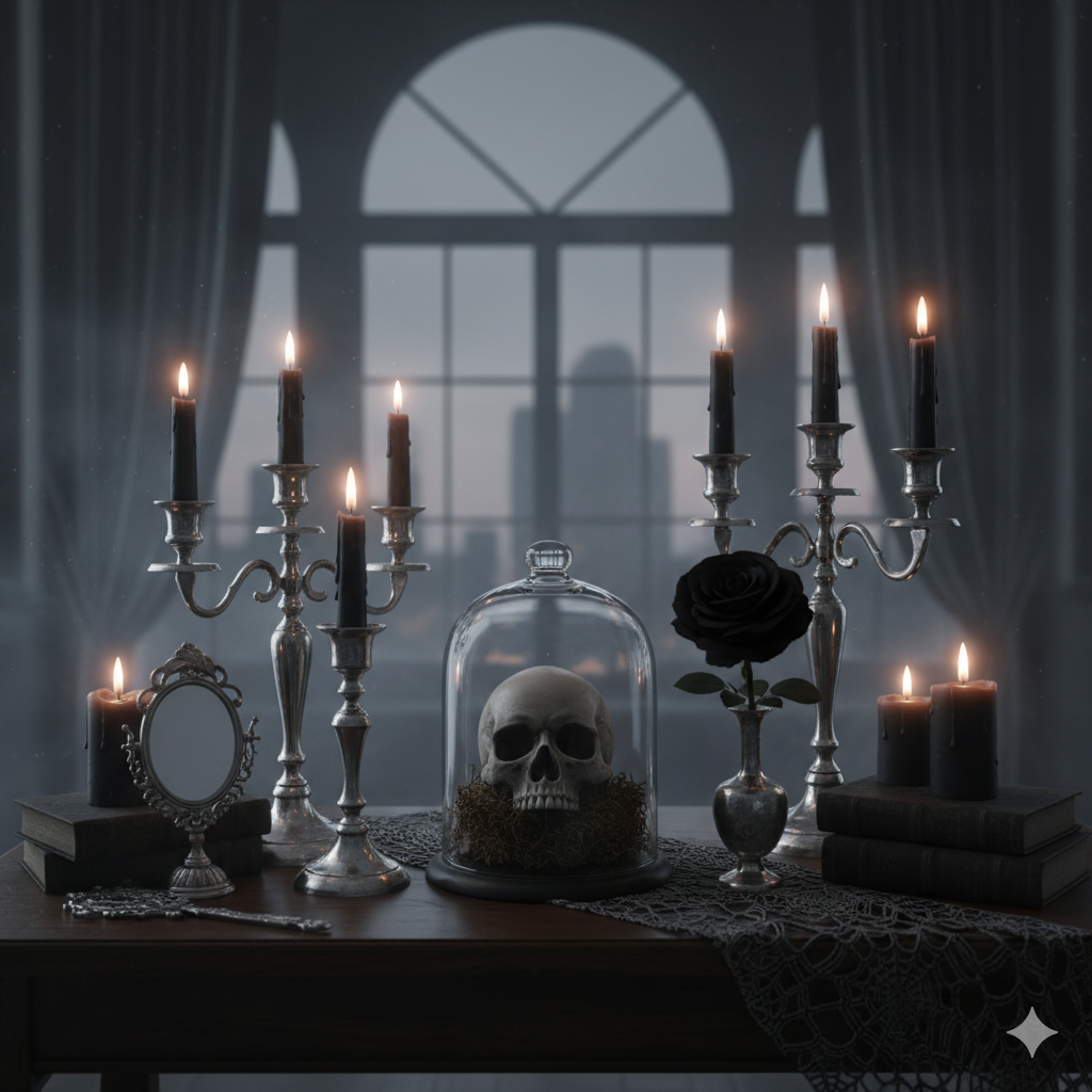 2.2. Gothic Elegance: The Romance of a Haunted Mansion This theme is inspired by the dark romanticism of the Victorian era. The color palette is deep and rich: burgundy, deep purple, black, and gold accents dominate. Key elements include black lace tablecloths, velvet pillows, dripping battery-operated candles, antique-looking candelabras, and gilded skeleton figures.
