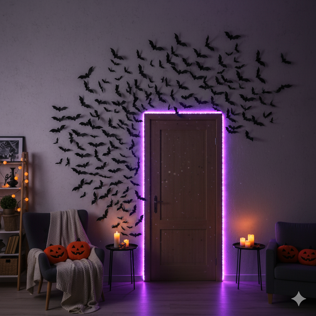 Create a "bat swarm" effect using black cardstock silhouettes that appear to fly up the wall from a corner. This not only adds a thematic touch but also emphasizes the room's height.