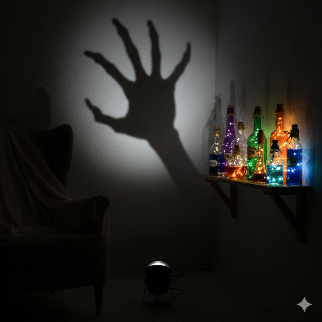 Shadow Theater: Create maximum dramatic effect with minimum materials. Place a simple spotlight on the floor and direct it towards an object (a skeleton figure, a dry branch) to cast a large, distorted, and spooky shadow on a blank wall.