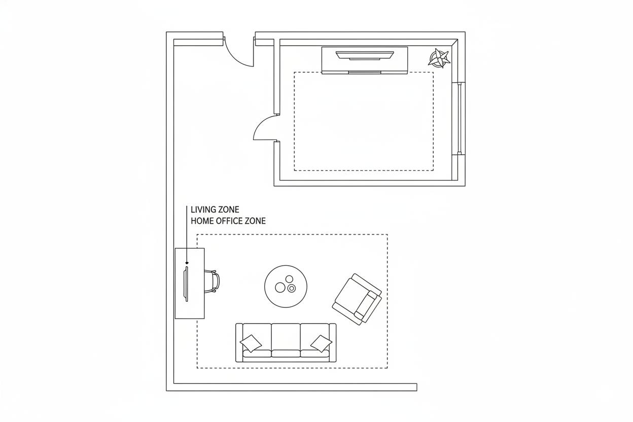 Zone 2 (The Bonus Space): In the secondary zone behind the sofa, create your second "room." This could be a home office with a desk and chair, a cozy reading nook with two armchairs and a task lamp, a music corner with a record player, or a dedicated play area for kids.