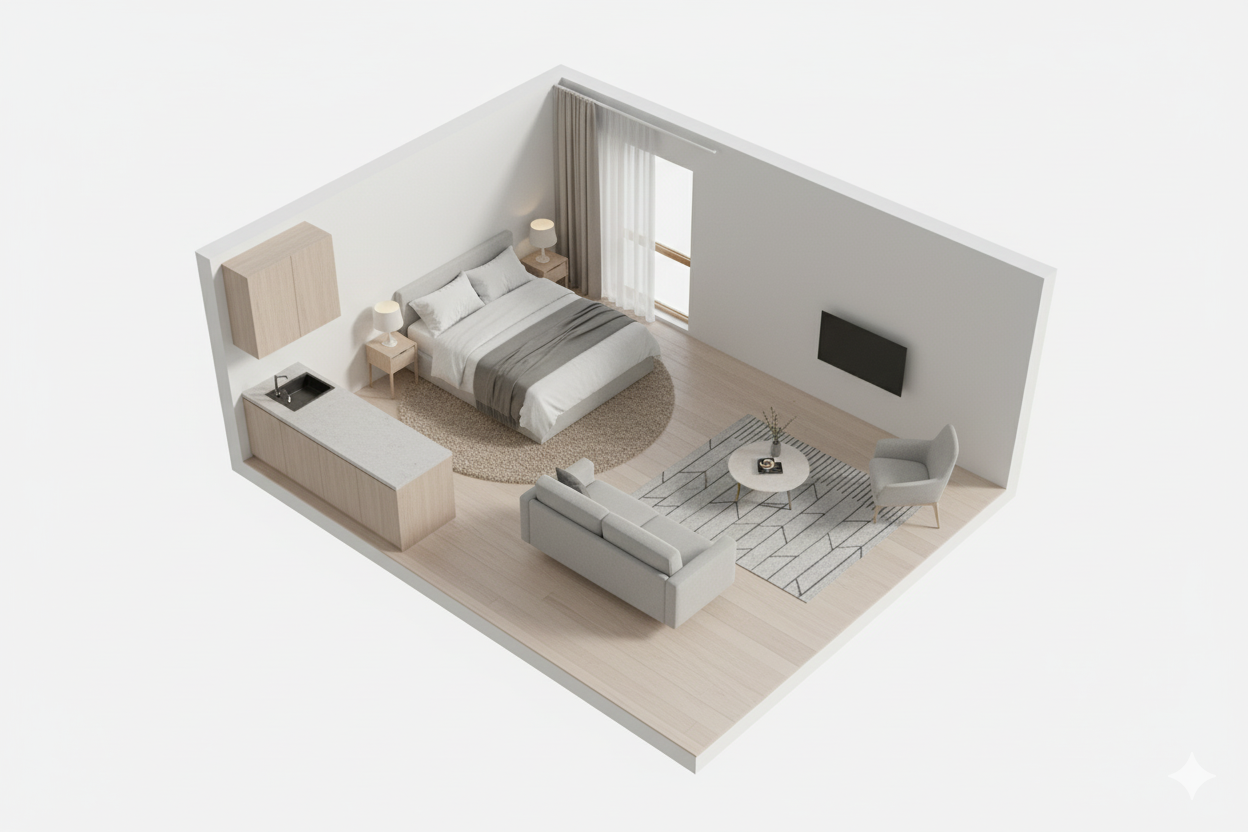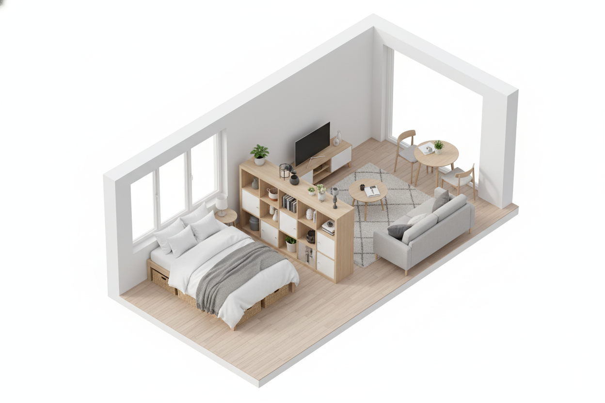 The Concept: This layout is for those who crave the privacy and definition of a separate bedroom but are working with a single open space. It uses a physical (but non-permanent) divider to cleverly carve out a sleeping nook, creating the powerful illusion of a true one-bedroom apartment without sacrificing light or airiness.