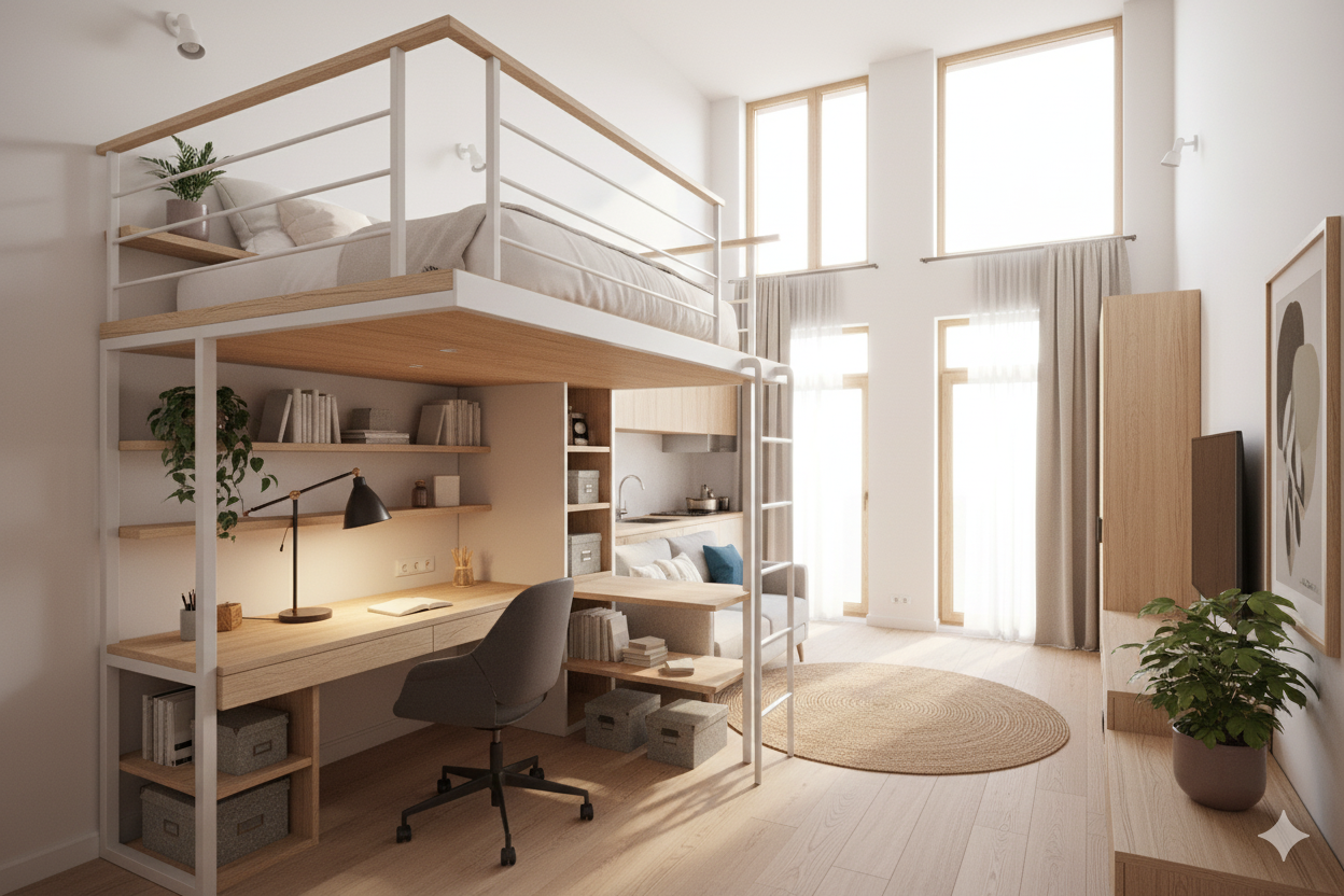 The Concept: If your studio is blessed with the one feature you can’t fake—high ceilings—then this layout is your ticket to literally doubling your living space. By thinking vertically, you can create a two-story home within a single room.